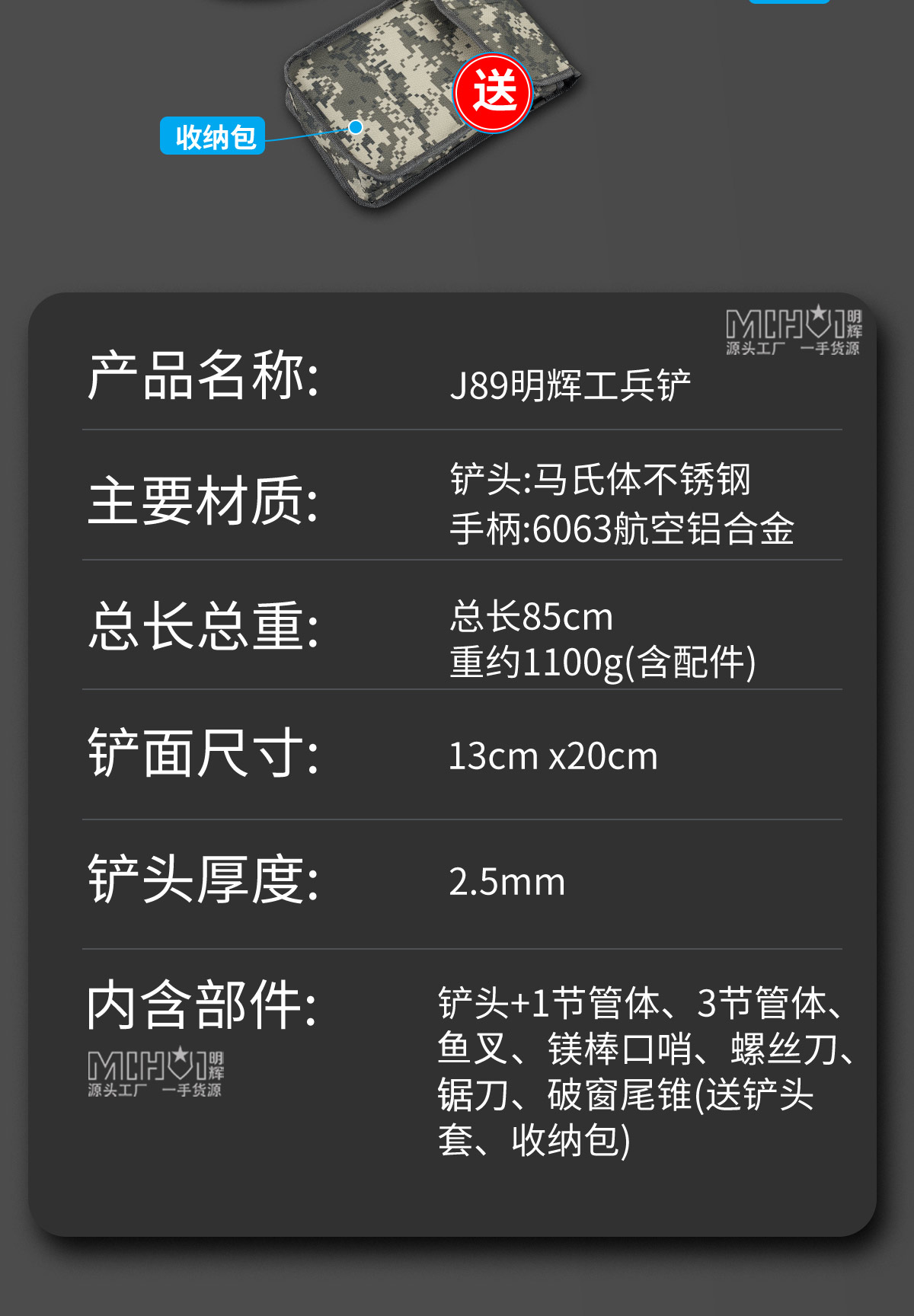 J89 Multifunction Tactical Shovel for Outdoor Camping Traveling Material: Stainless Steel + Aluminum Length: 85cm weight: 1100g blade size: 13x20cm Sent E-mail INQUIRY BASIC INFO J89 Multifunction Tactical Shovel for Outdoor Camping Traveling [Next Product]→: J99 Portable Folding Shovel Multi Purpose Steel Spade Multifunction Tactical Shovel Outdoor for Camping Traveling RELATED Multifunction shovel sets G88 Multifunction shovel sets G80 Multifunction shovel sets G28 J80 Aluminum Multi-purpose Folding Survival Shovel for Camping SURVIVAL Multifunction shovel sets G07 Multifunction shovel sets G90
